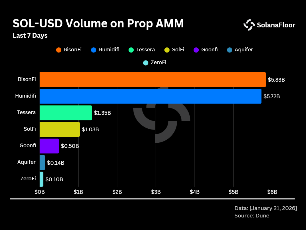 Looking at shorter time frames further illustrates the scale of Prop AMM adoption. Over the past seven days alone, more than $11.5B in trading volume through $SOL-$USD pairs has been executed on BisonFi and HumidiFi combined, cementing their position as the two largest Prop AMMs on Solana. Tessera and SolFi follow at a distance, with $1.35B and $1.03B in weekly volume, respectively.