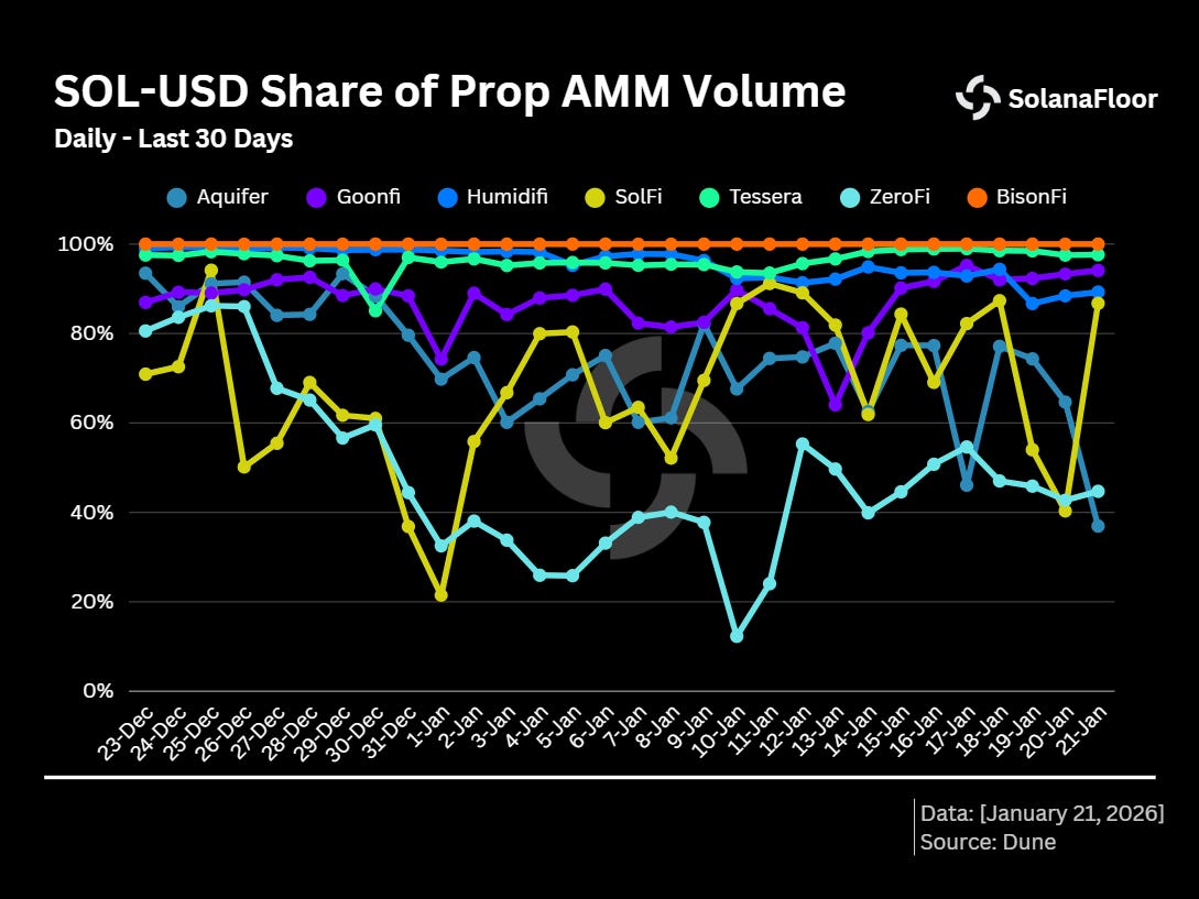 Trading activity across Prop AMMs remains heavily concentrated in $SOL-$USD pairs. On BisonFi, 100% of recorded volume over the past 30 days has been routed through this pair. HumidiFi shows a similar pattern, with more than 89.2% of its volume tied to $SOL-$USD. However, this represents a modest diversification compared to the previous month, when $SOL-$USD accounted for over 99% of its activity.